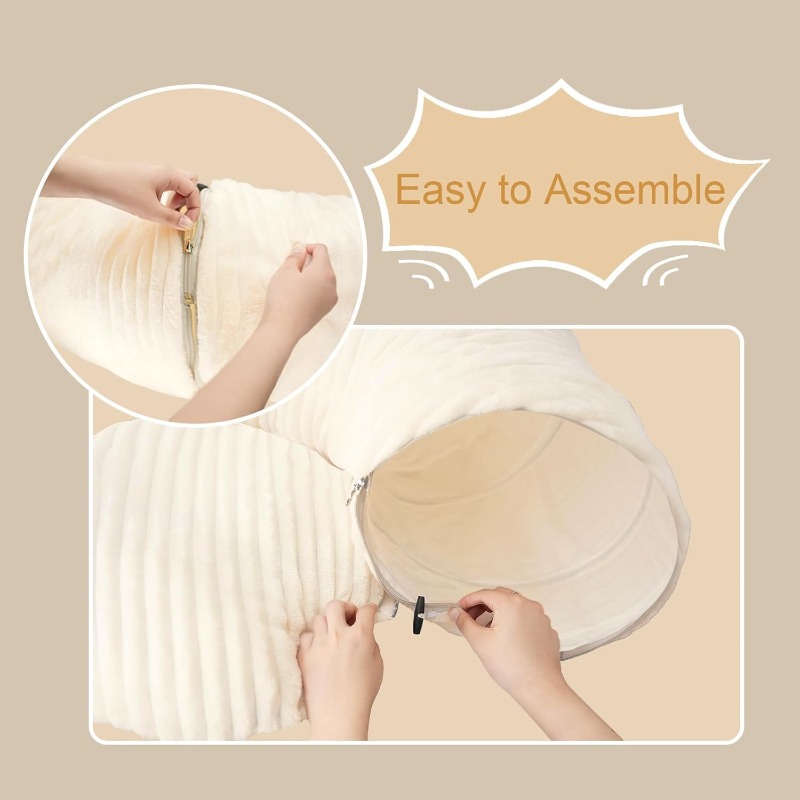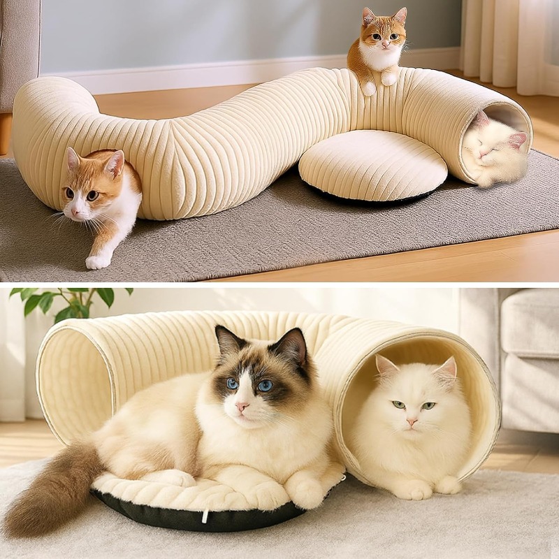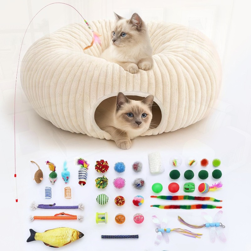 40 Toys & Collapsible Cat Tunnel Bed with Soft PP - 2-in-1 Play Cave & Hideout for Kittens & Small Cats, Foldable S/R/C-Shaped Tube, 10"/15" Space-Saving Design, Compatible with Indoor Pets Under 30 lbs (Kittens/Puppies)