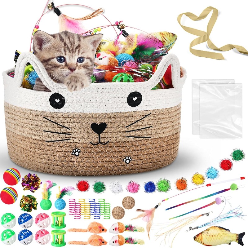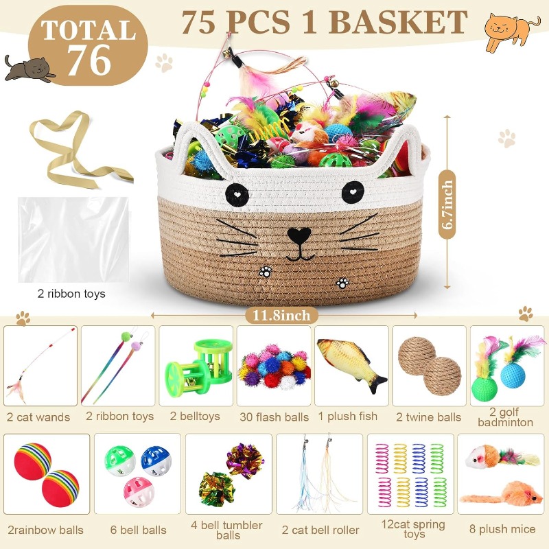76pcs Interactive Cat Toys Set with Storage Basket - No Batteries Needed, Safe for Kittens & Cats - Hunting Wand, Spring Balls, Crinkle Balls, Bell - Indoor Play to Stimulate Hunting Instincts - Ideal Gift for Cat Owners - Khaki