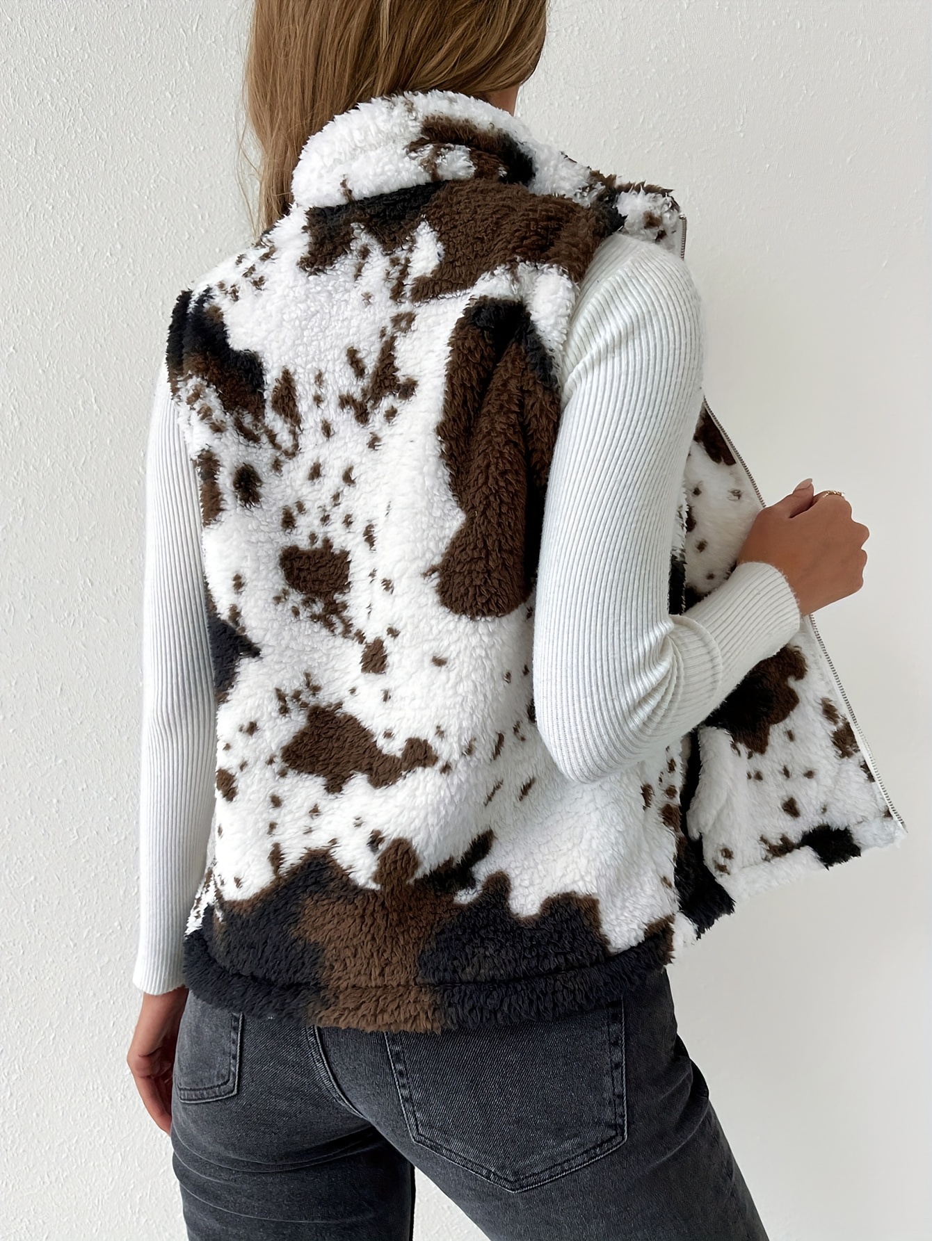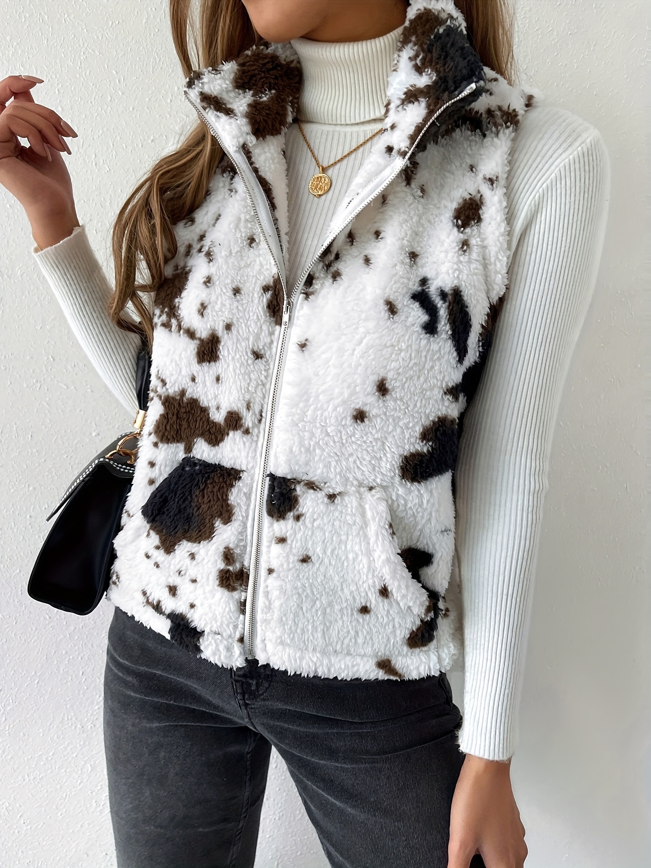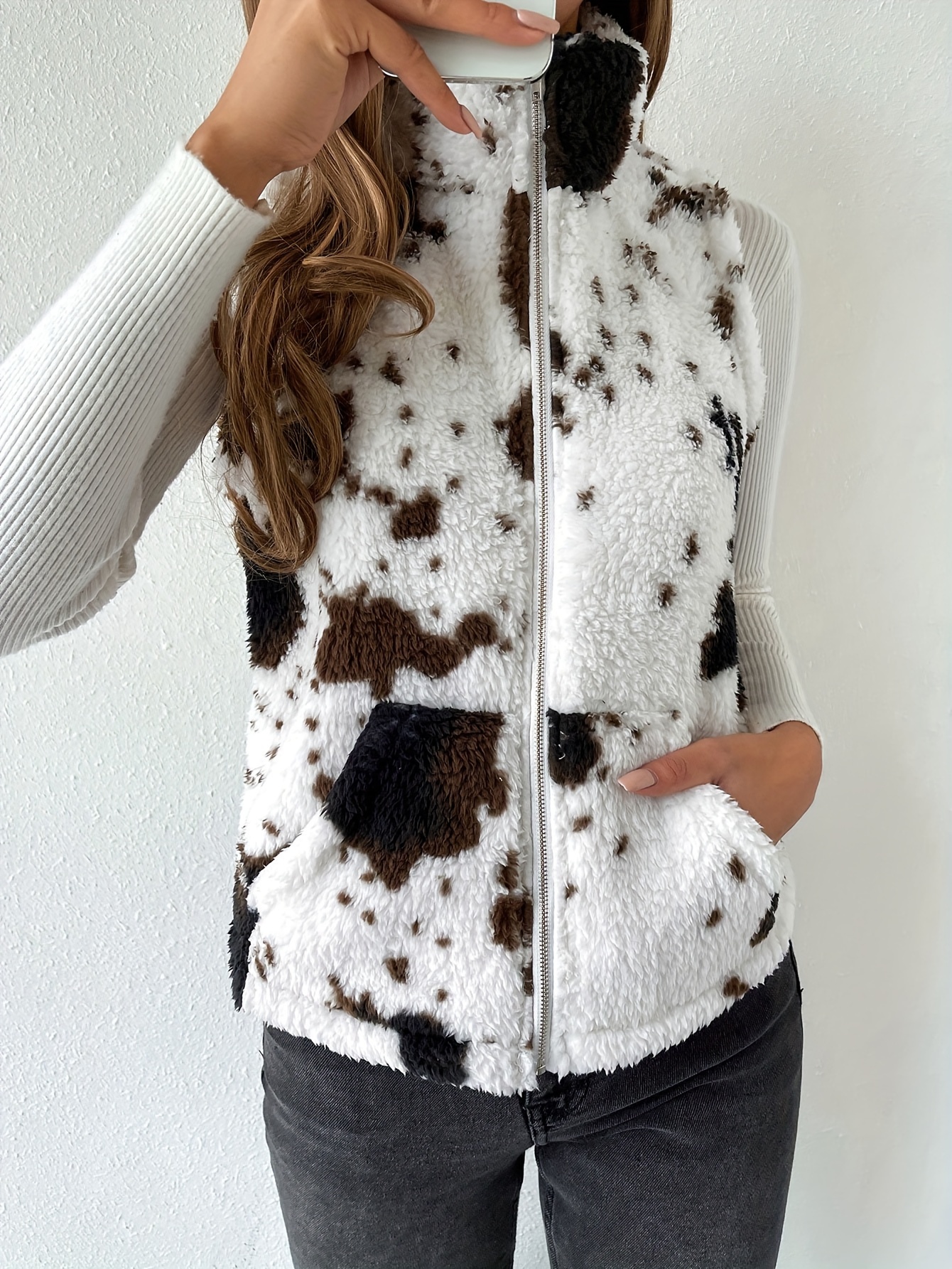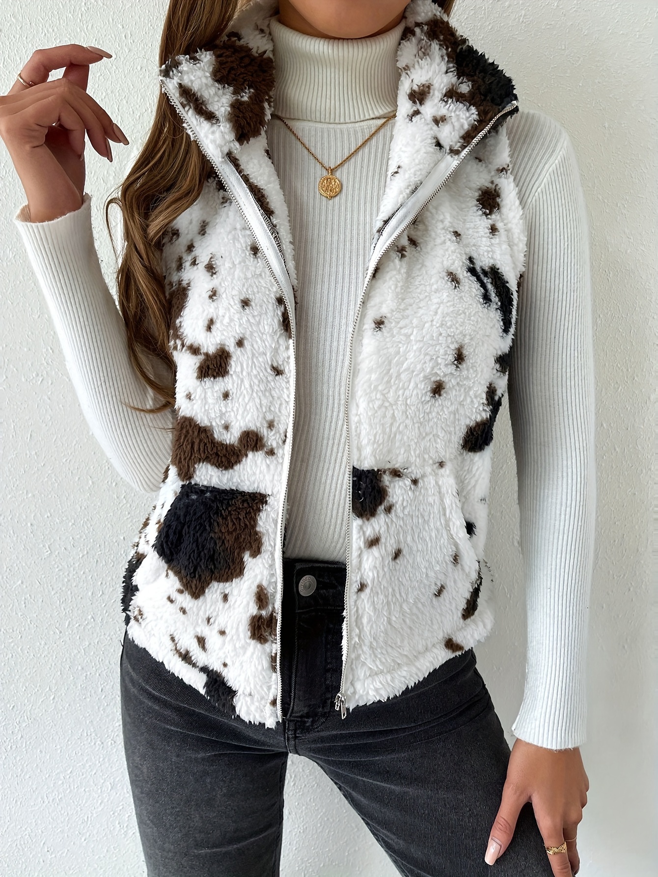 Cozy Cow Pattern Plush Vest Jacket - Soft, Warm, and Casual Sleeveless Gilet with Slant Pockets for Winter & Fall - Women's Fashion Clothing for Everyday Wear