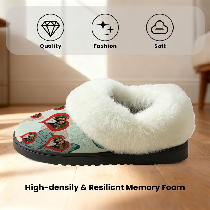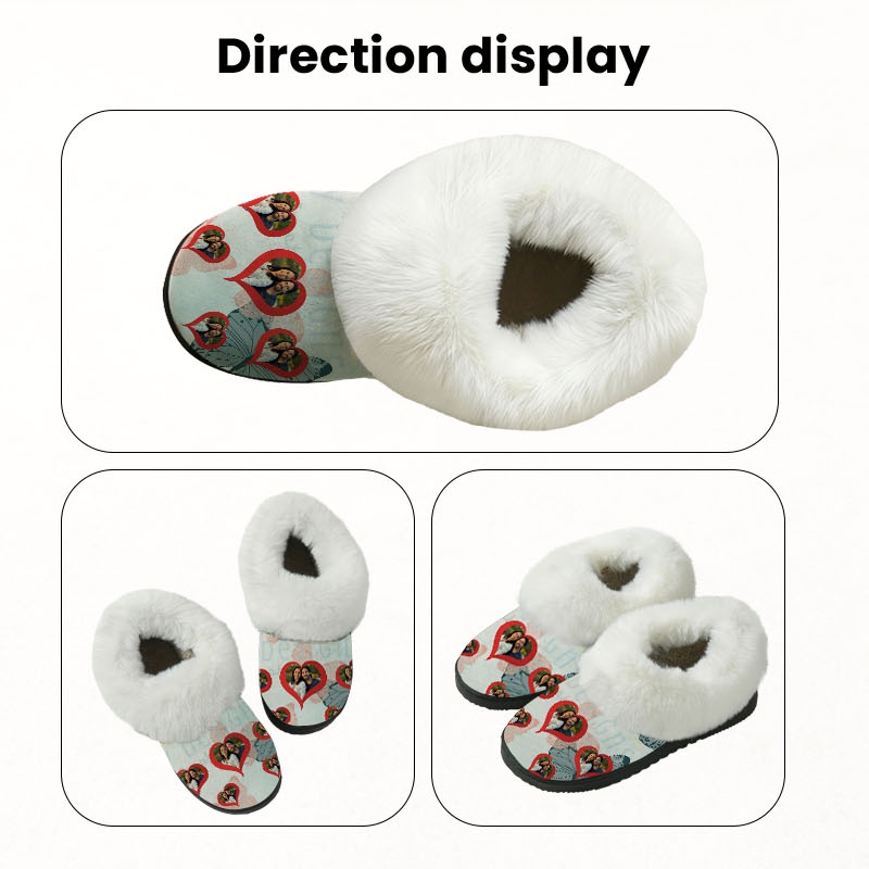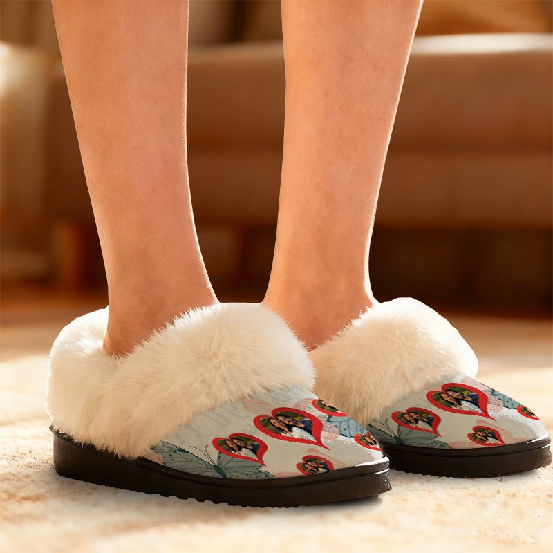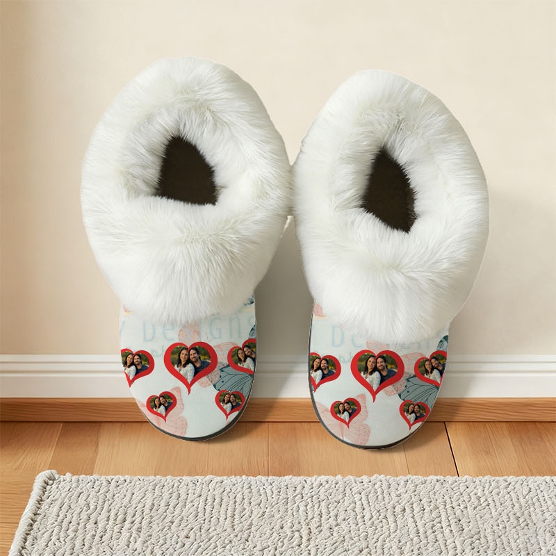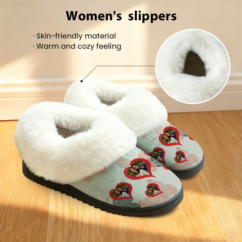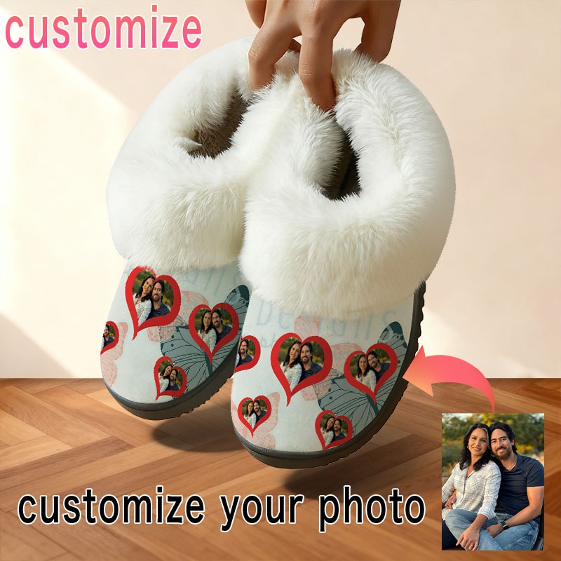 Custom Plush Slippers with Photo and Pink-Gray Butterfly Sun Design, Non-Slip House Slippers, Warm Winter Slippers, Soft and Comfortable, Customizable for Couple Photos, Family Photos, Pet Photos, Ideal Gift for Mother, Wife, Partner, Sister, Women