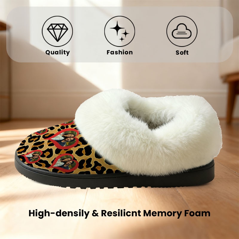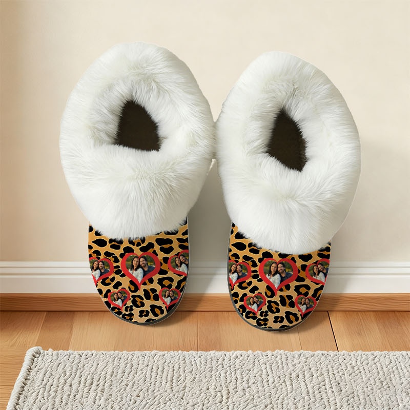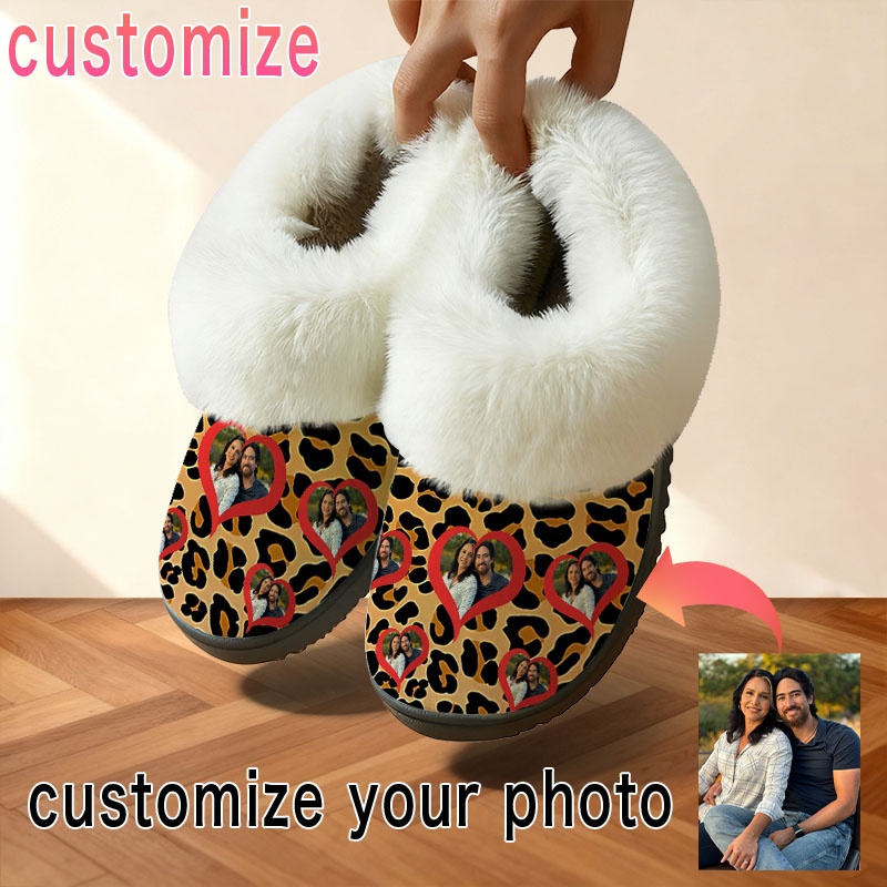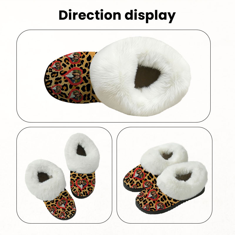 Custom Plush Slippers with Your Photo And Leopard Print Design on a Beige Base, Perfect for Quiet Home Wear, Warm for Winter, Soft And Comfortable. Customizable with Couple Photos, Family Pictures, Pet Images, Or Commemorative Photos, Women Shoes