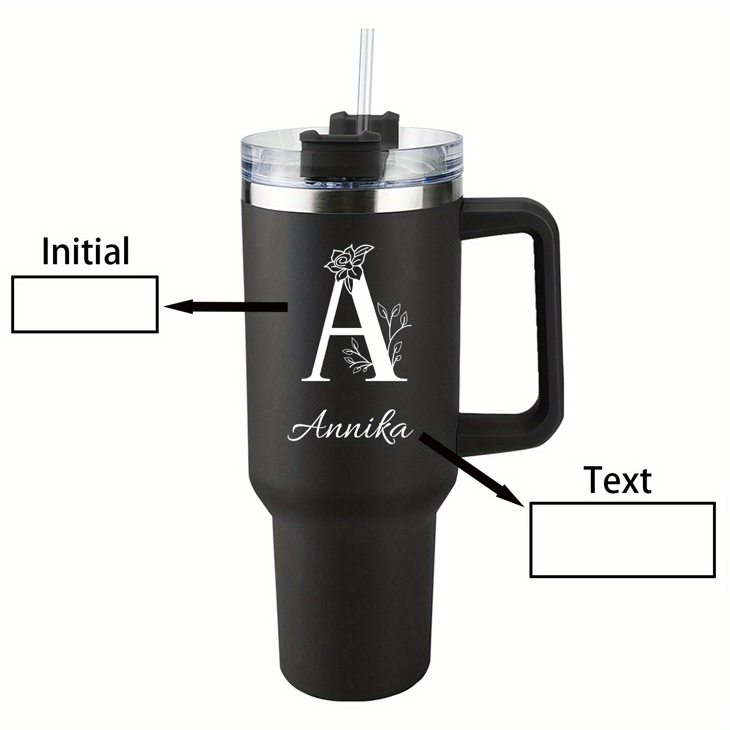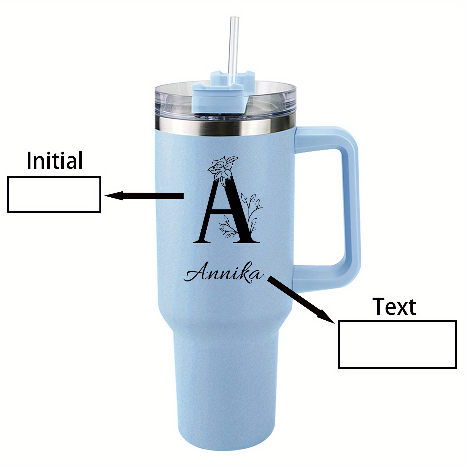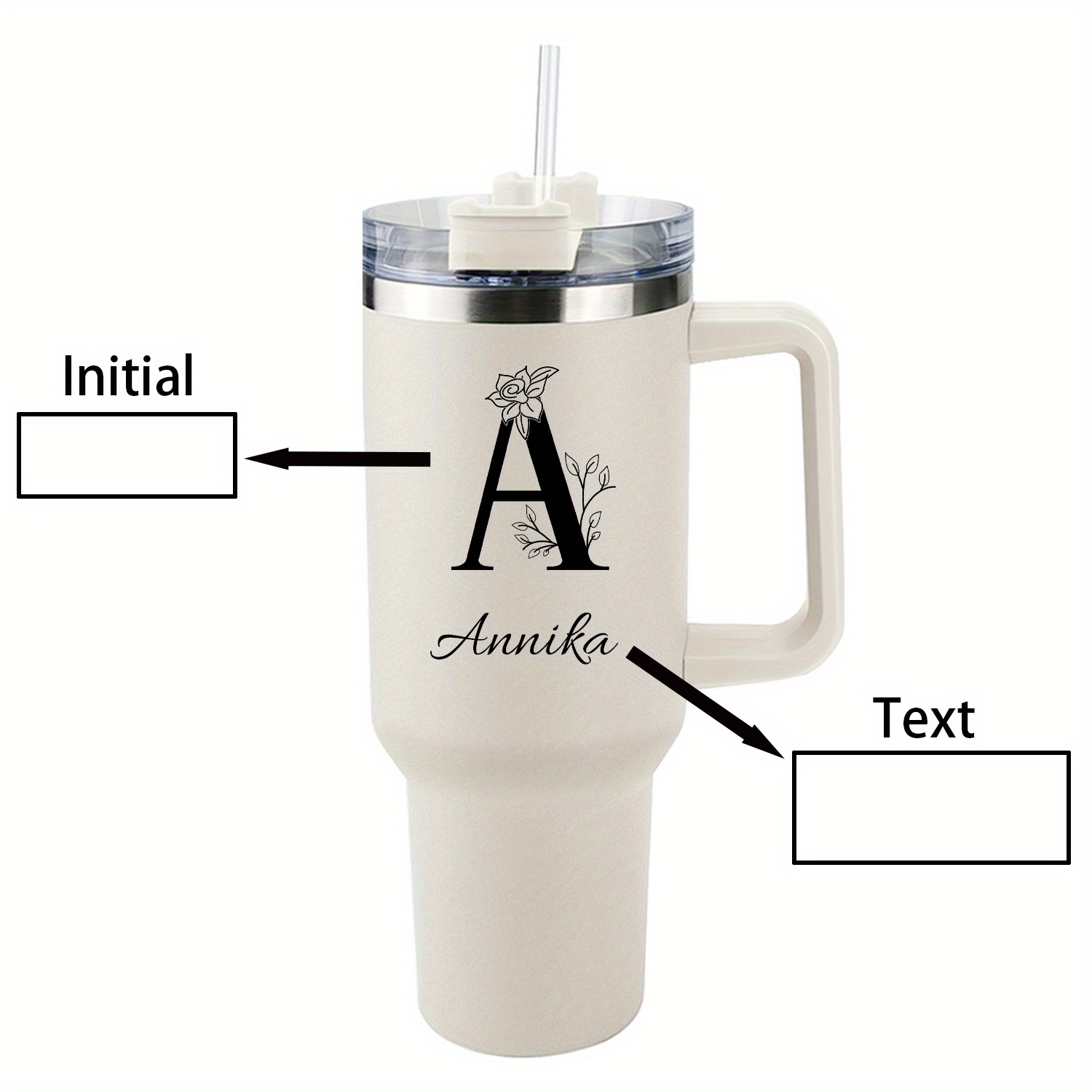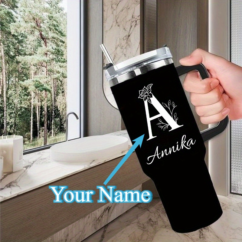 Customized Name Thermos Cup, 40oz, Double Wall Stainless Steel Handle Insulated Coffee Cup, Large Capacity with Lid And Straw, Personalized Gift with First Letter Flower Design, Travel And Office Cup, Birthday Gift for Family And Friends,