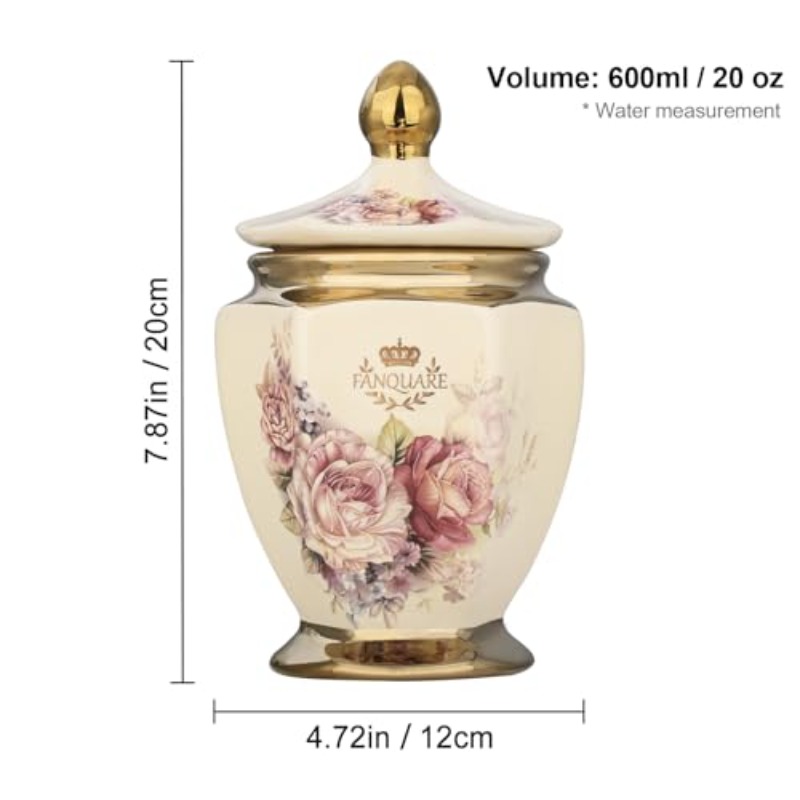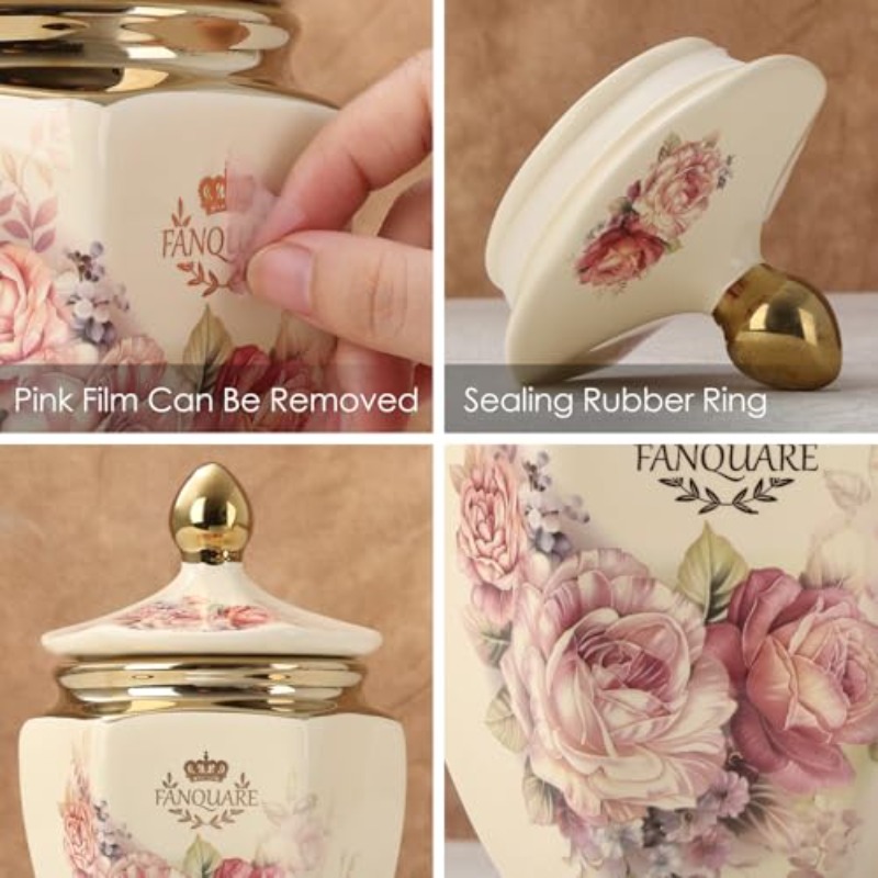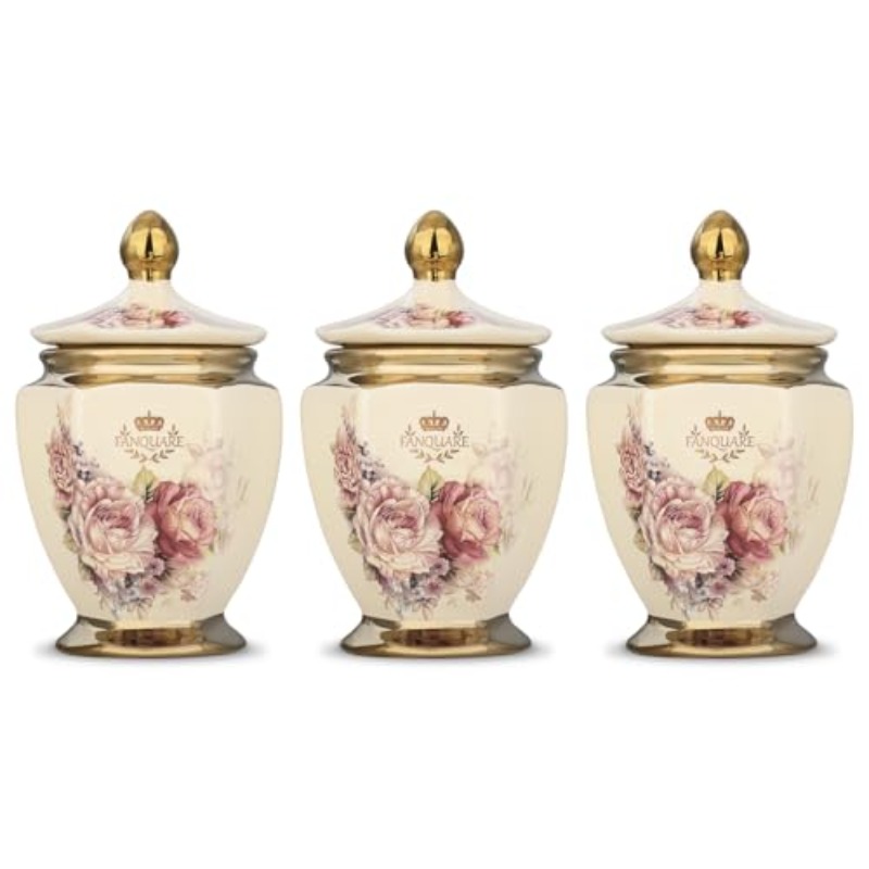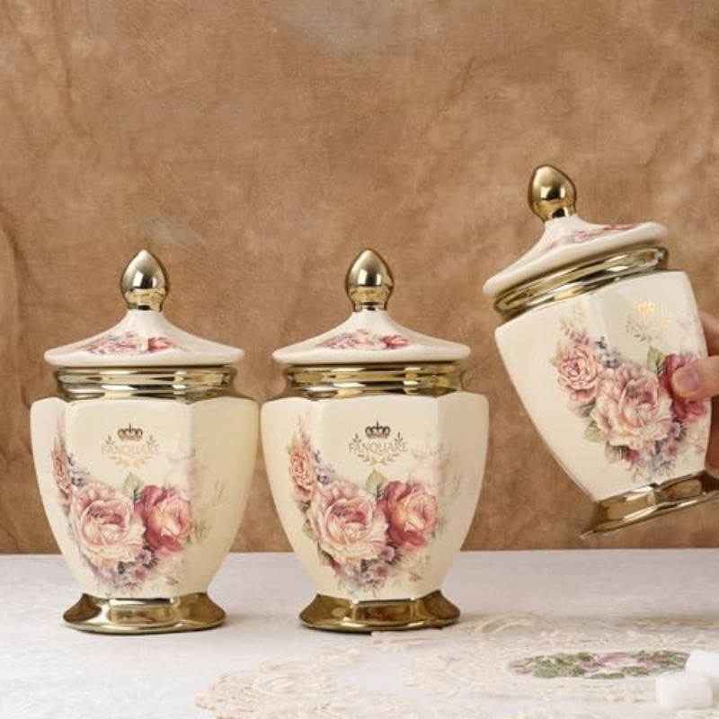 fanquare Vintage Royal Style Decorative Canisters with Gold Trim Floral Porcelain Sugar Bowl Set of 3 with Airtight Lid for Countertop Party