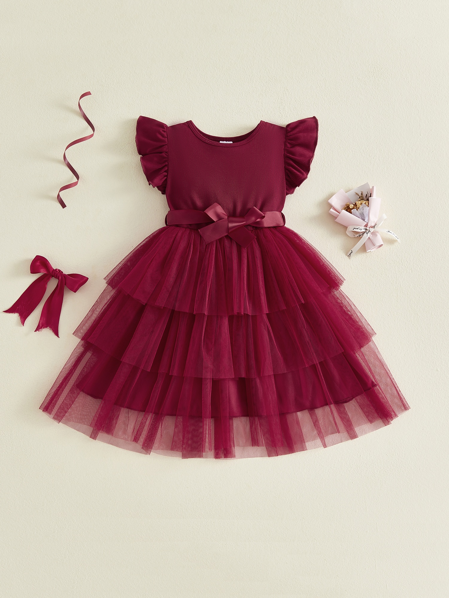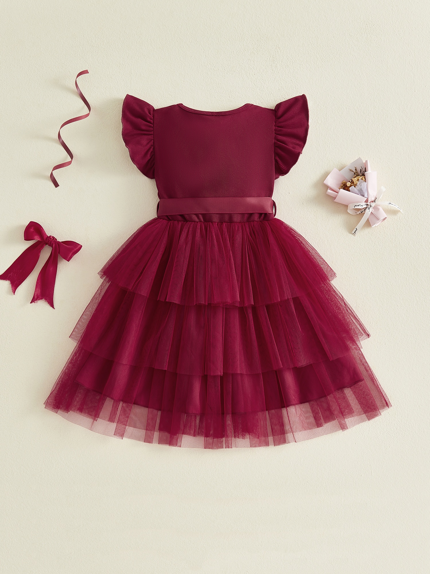 Girls' Elegant Princess Dress with Layered Ruffle Tulle, A-Line Flying Sleeve Dress & Belt - Machine-Washable Wedding Outfit for Girl,, Kids - Summer