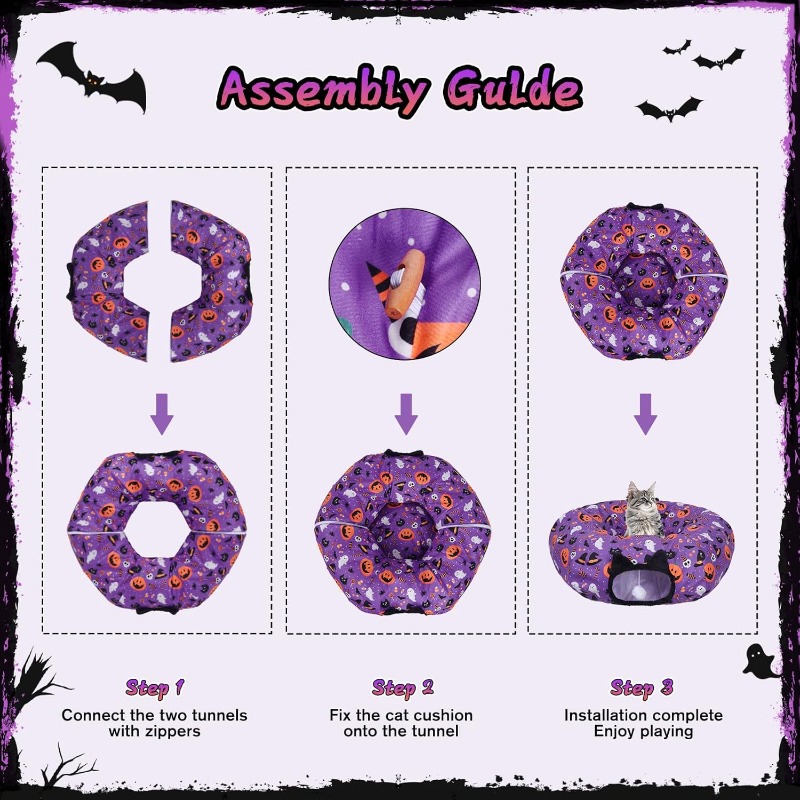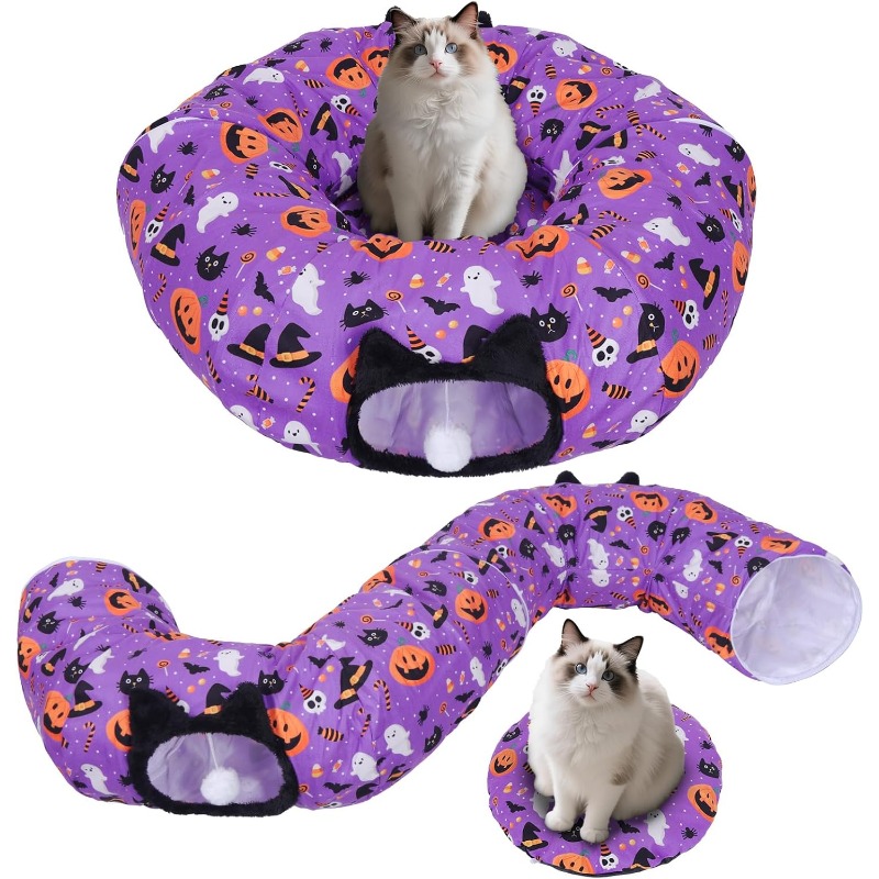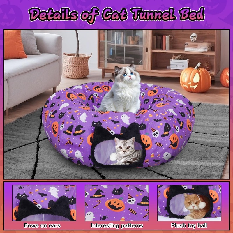 Halloween Cat Tunnel | Foldable Pet Donut Bed with Washable Mat and Dangling Balls, Pumpkins Spider Candy Pattern Decor, Ideal for Indoor Cats
