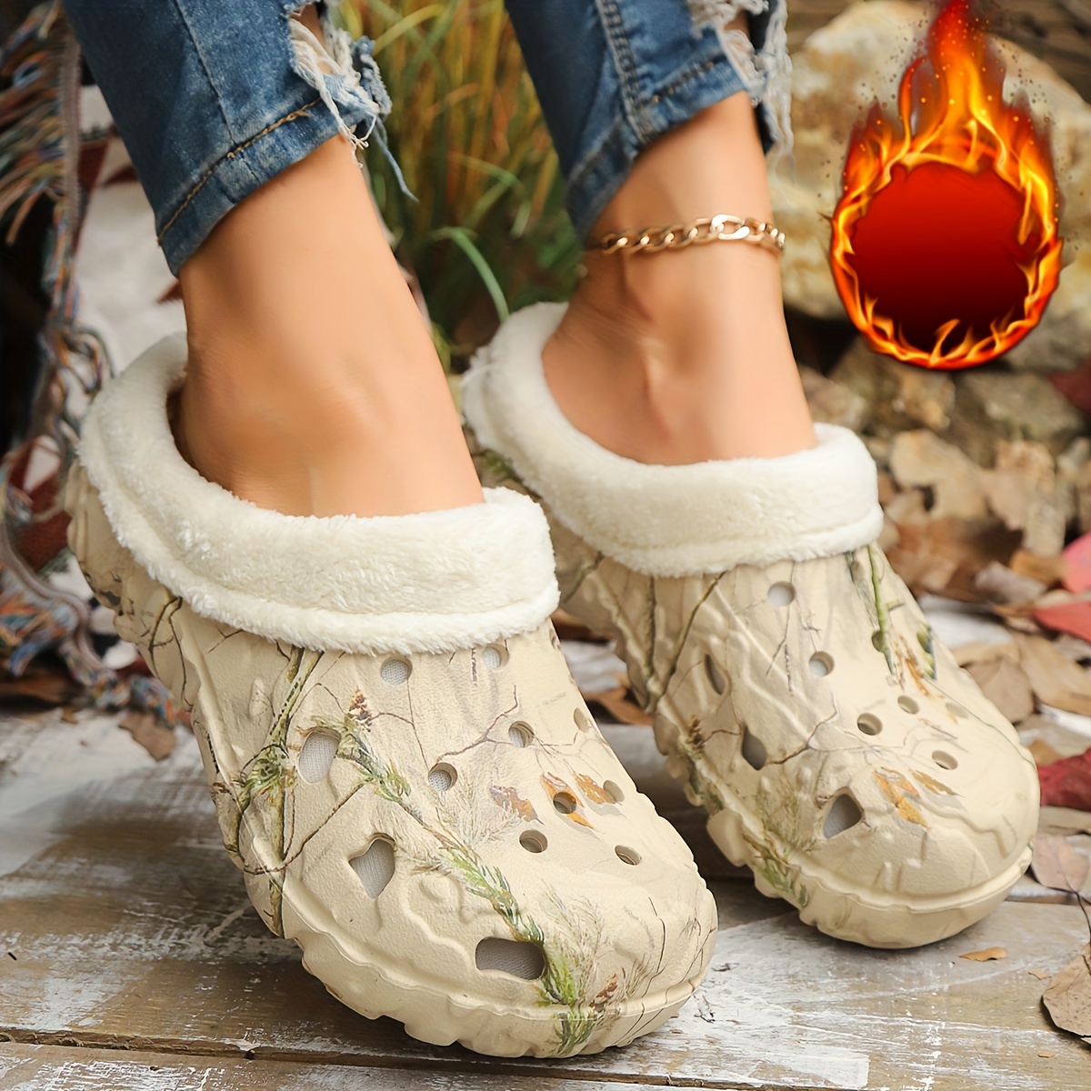 Ladies Winter Camouflage Printed EVA One-Pedal Shoes with Fluff faux fur Lining | Non-Slip, High Quality Indoor/Outdoor Comfort, Breathable Holes, Deodorant Technology, All Day Warm, Outdoor Footwear