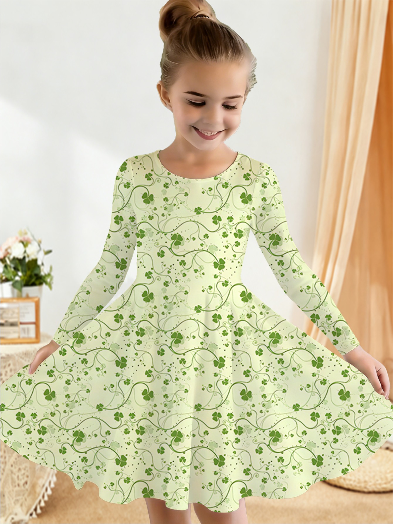 New Fashion Retro Clover Vine Printed Dress for Girls in Spring, Autumn and Summer. Long-sleeved, Round-neck, Casual Style. Retro, Fresh and Vibrant. Suitable for Outdoor Outings/ Holiday Wear/ Holiday Gifts for Children.