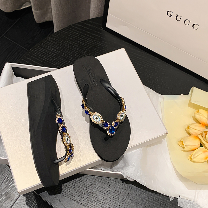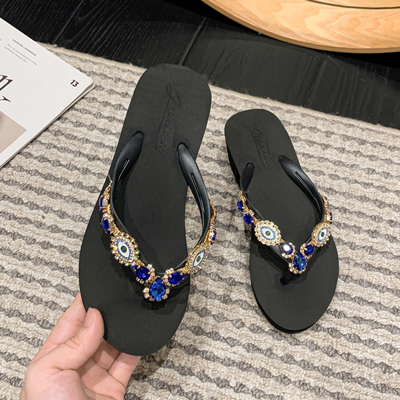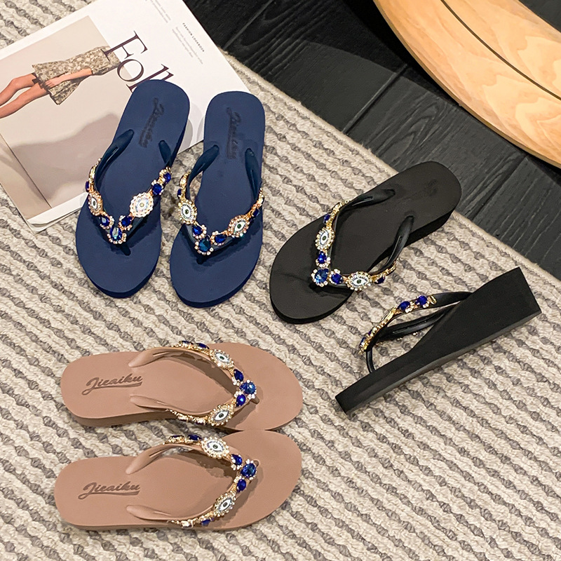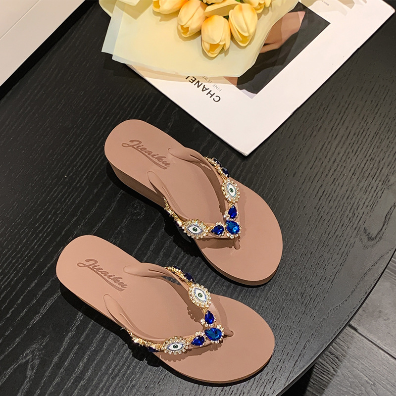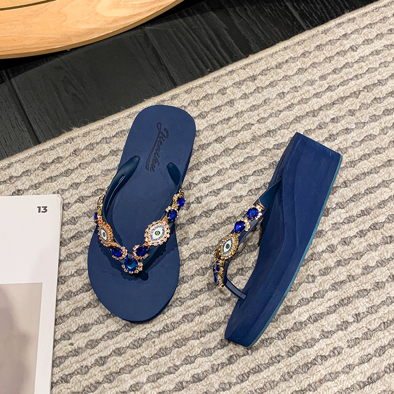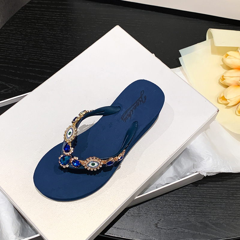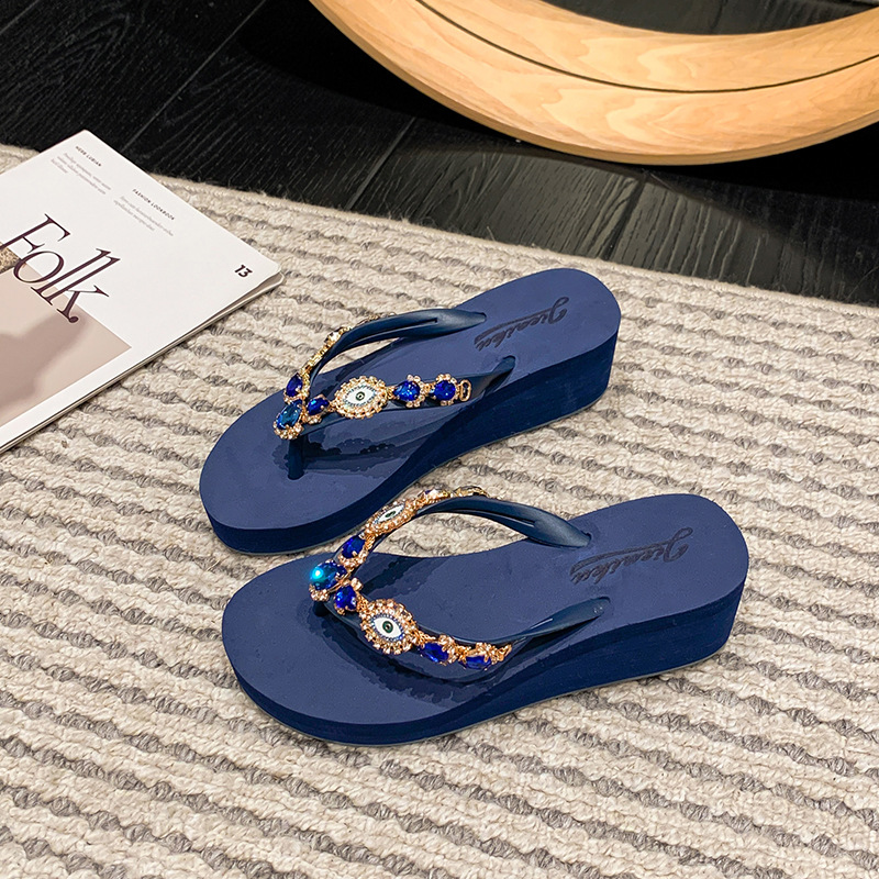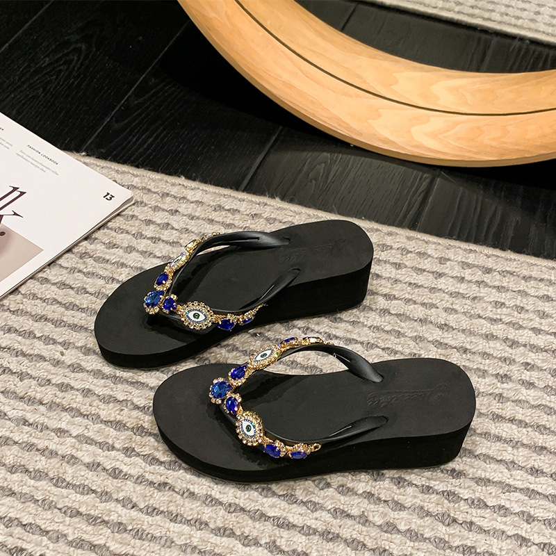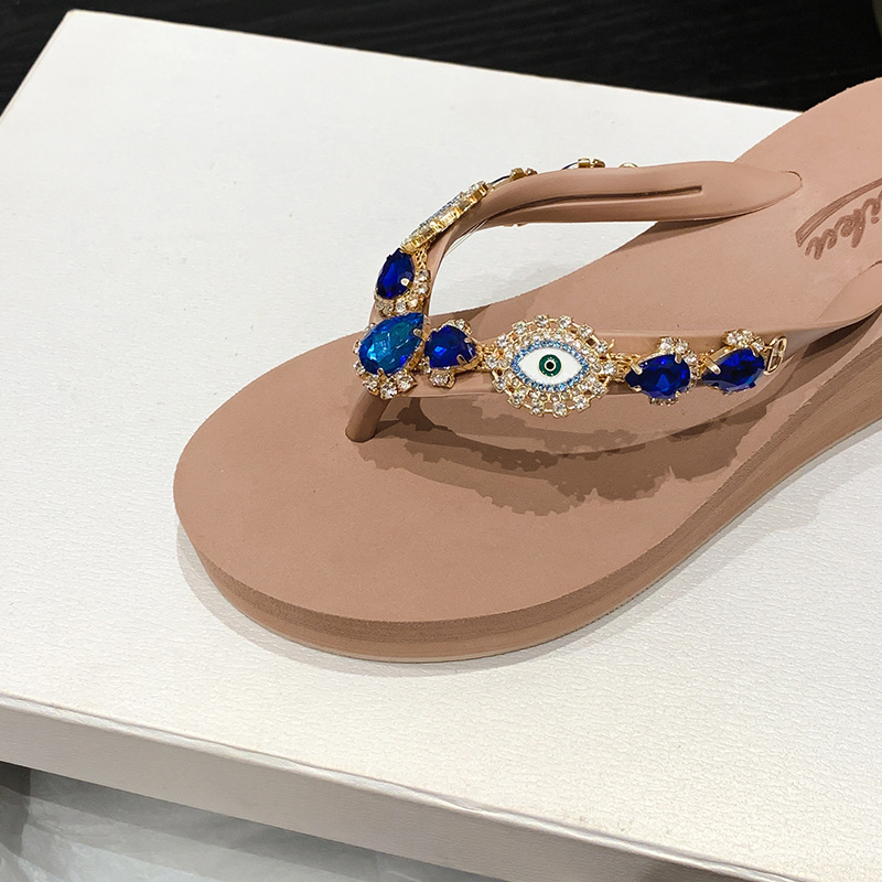 Summer New Blue Eye Rhinestone Flip-Flops for Women, Outdoor Wedge Thick-Soled Beach Sandals, Women Shoes