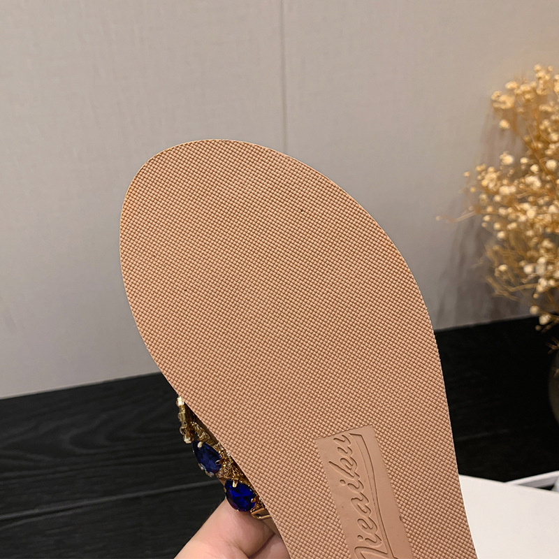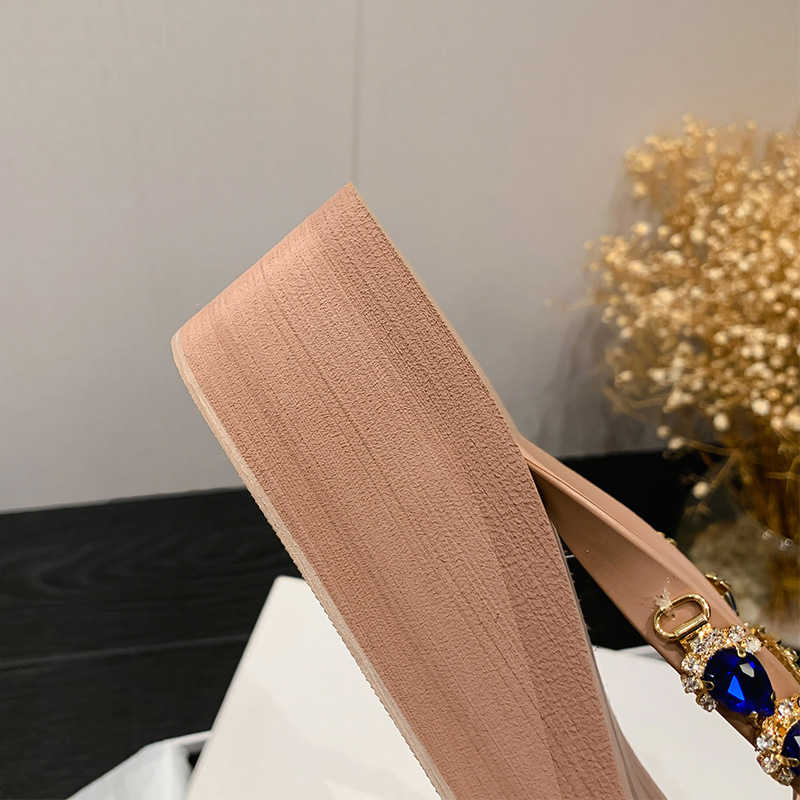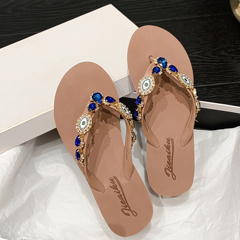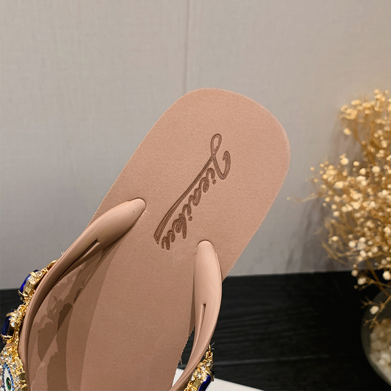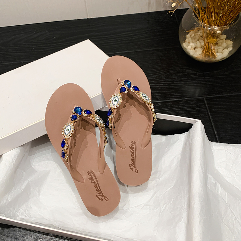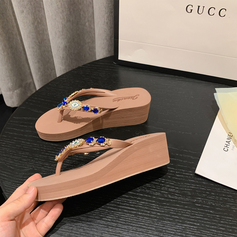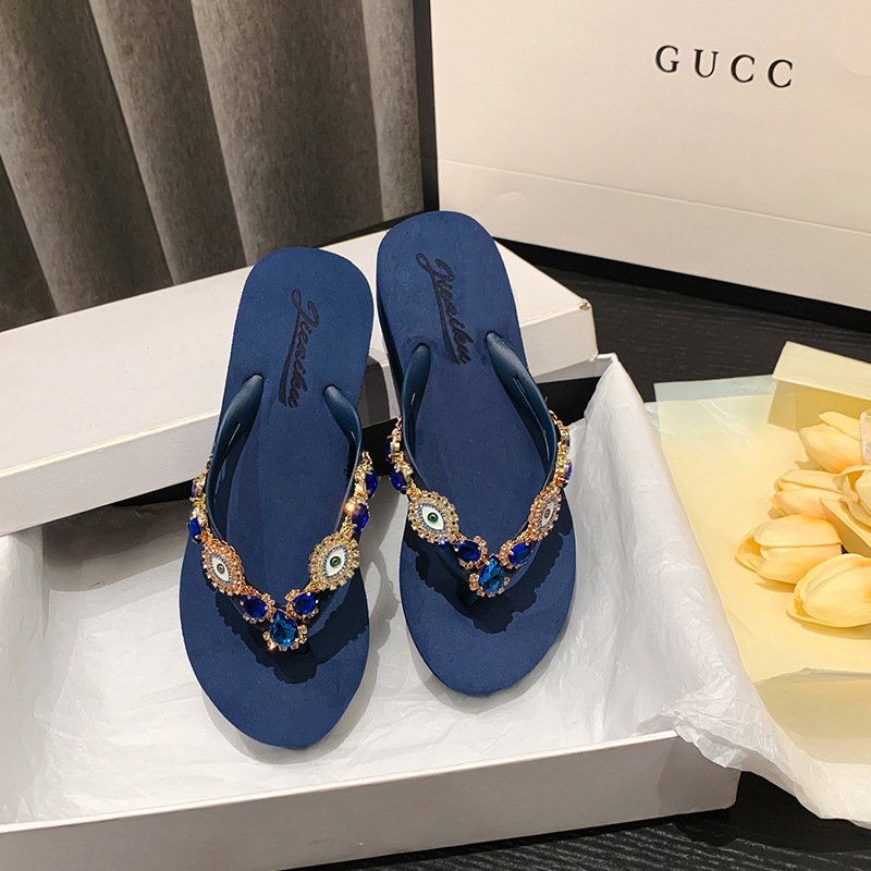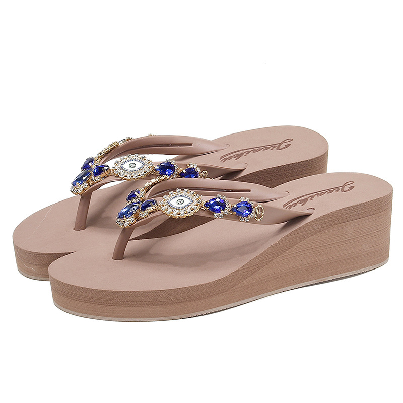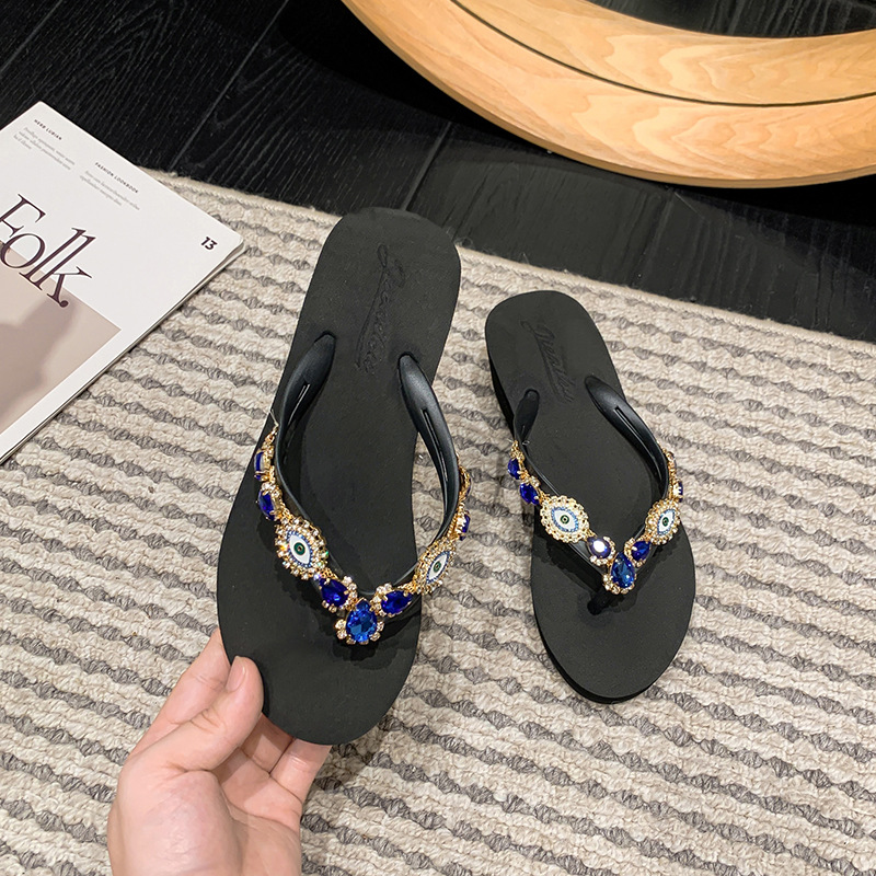 Summer New Blue Eye Rhinestone Flip-Flops for Women, Outdoor Wedge Thick-Soled Beach Sandals, Women Shoes